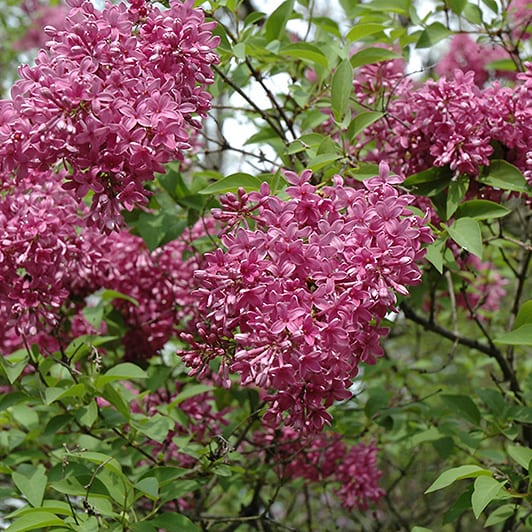 The fragrant purple flowers appear in mid-May. Small leaves and minimal suckering make it a more refined plant than the common lilac. The blooms perform poorly as cut flowers.
