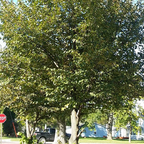 American basswood (usually called American linden in the horticultural business) is a stately and well formed deciduous tree with large heart-shaped leaves, a clean, straight trunk, and a broad, rounded crown. Basswood gets 60-80 ft (18.3-24 m) and occasionally over 100 ft (30.5 m) tall with a spread of about half its height. Young trees are columnar; mature trees develop a broad, spreading crown. The trunk is straight, free of branches for a considerable height, and the bark is light brown and smooth, becoming darker and deeply furrowed on older trees. The leaves are 4-8 in (10-29 cm) long and 3-5 in (7.6-13 cm) wide, broadest near the base and pointed at their tips. The leaves have coarsely toothed margins and may or may not be white and fuzzy on the underside. Plants with downy-white leaf undersides may be referable to var. heterophylla, usually called “white basswood.” Basswood has peculiar and very distinctive straplike leafy bracts from which are suspended clusters of sweetly fragrant (but not very showy) flowers. The bracts are the color and texture of leaves, and are 4-5 in (10-13 cm) long and about an inch wide. The flowers are about 1/3 in (0.8 cm) across, and borne in clusters of 10-20 which are suspended from the bracts on slender stalks. The flowers are pollinated by bees. Basswood fruits are round and woody, about 1/3″ in diameter. Several cultivars have been selected. ‘Fastigiata’ is narrow and conical with ascending branches. ‘Redmond’ is pyramidal in form and has larger leaves.